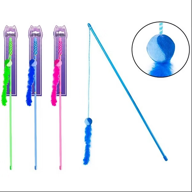 Keep your feline friend entertained for hours with our irresistible teaser toy. Crafted in vibrant blue, pink, or green, this toy features a bell and tail toy attached to a sturdy wand, providing endless fun for your cat.